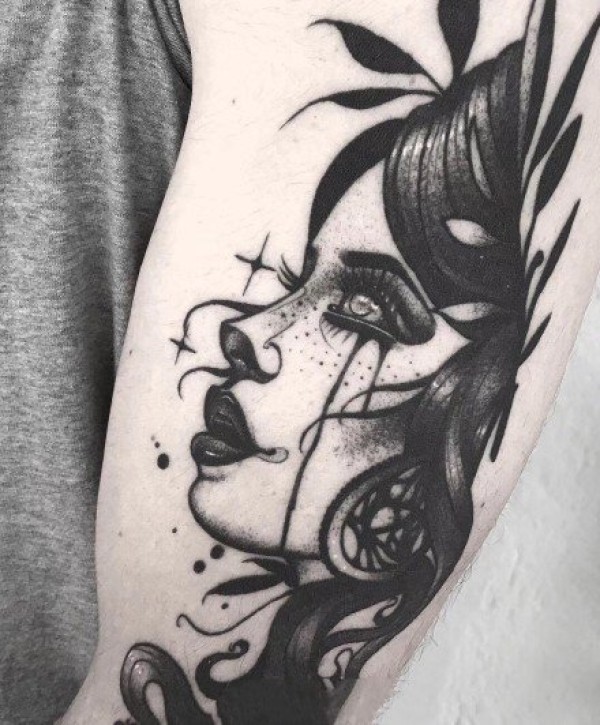 手臂上经典的点刺黑灰女郎纹身图案