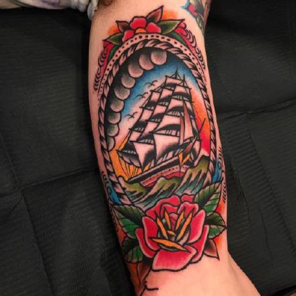 school欧美手帆船海浪玫瑰纹身图案手稿