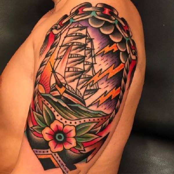 大臂纹身图 男生大臂上阴森的海盗船纹身图片