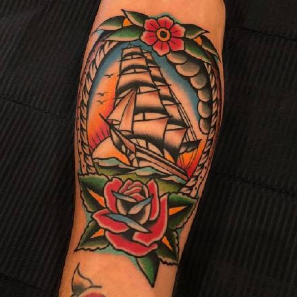 school欧美手帆船海浪玫瑰纹身图案手稿