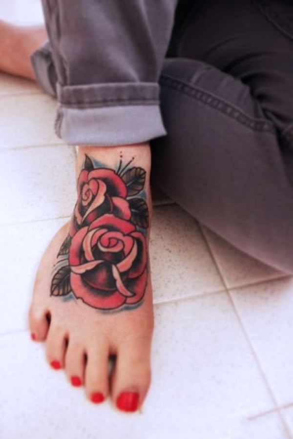 鲜艳明亮的脚背花朵纹身图案