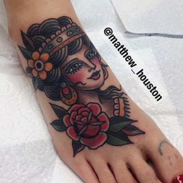 脚背上的oldschool彩色纹身图案