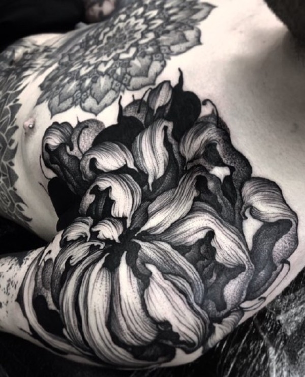 纹在手臂胳膊上的黑灰素花花卉纹身图案欣赏