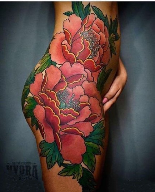 性感的一组女性臀部屁股上艳丽花朵纹身图案