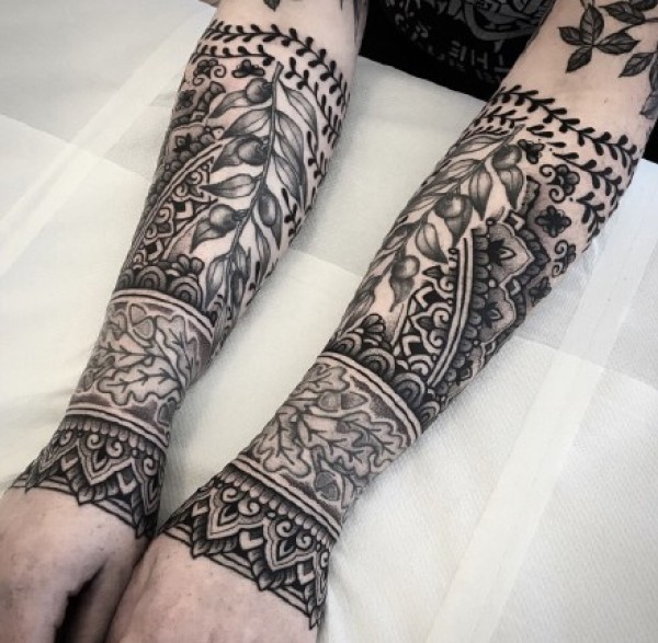 一组环绕手臂脚部的繁花图腾臂环纹身