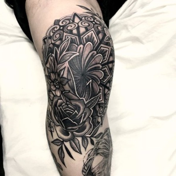 纹在膝盖上的oldschool梵花纹身图案
