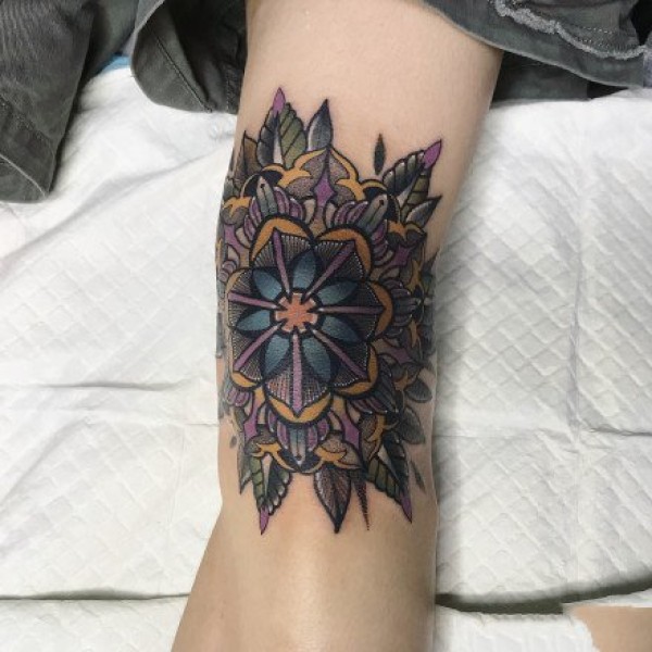 纹在膝盖上的oldschool梵花纹身图案