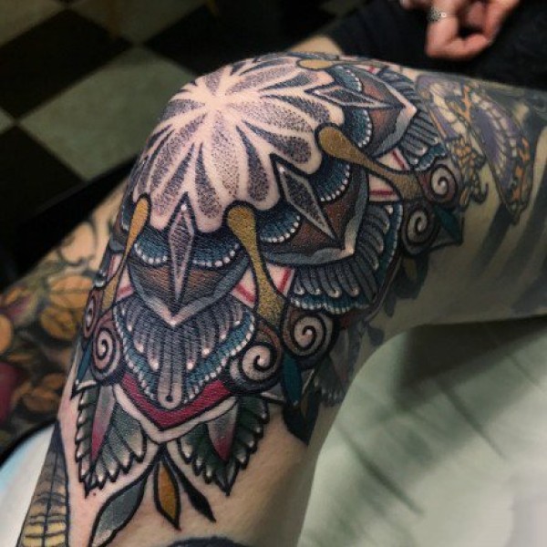 膝盖上的黑色点刺梵花图腾纹身作品图案