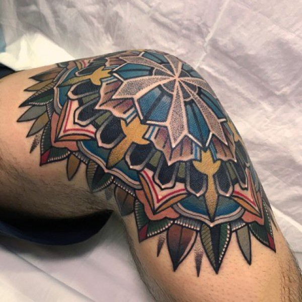 膝盖上的黑色点刺梵花图腾纹身作品图案
