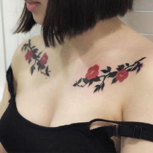 女生肩花纹身_15张女性双肩对称的肩花纹身图案作品图片