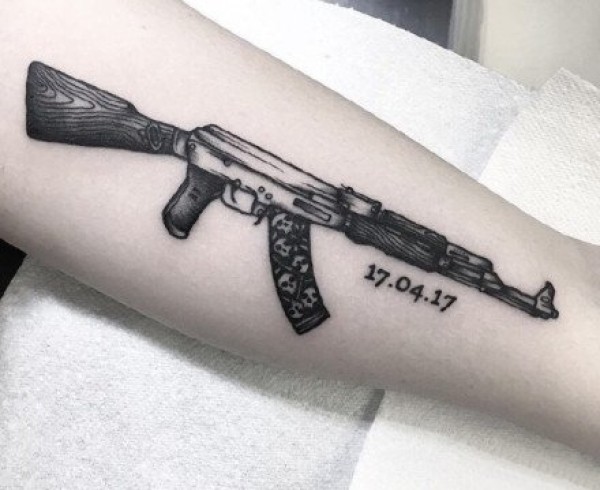 小臂手枪点刺黑灰纹身图案