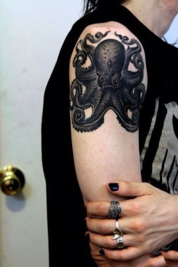 缠绕在肩膀上的漂亮章鱼纹身图案