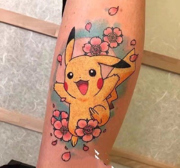 皮卡丘纹身图 男生手臂上花朵和皮卡丘纹身图片