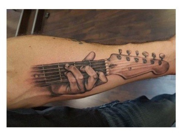 男生手臂上黑色简单线条星空元素手弹吉他纹身图片