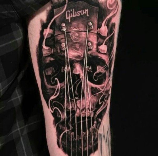 双大臂纹身 男生大臂上彩色的吉他纹身图片