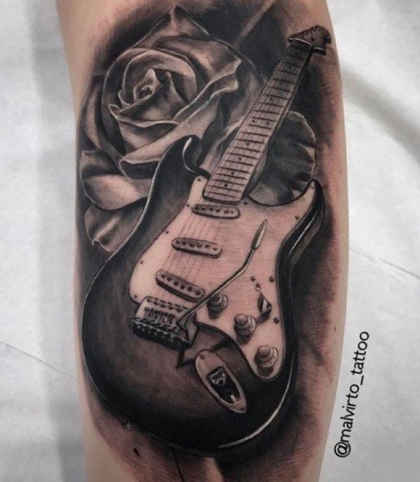 欧美花臂纹身 男生手臂上花朵和吉他纹身图片