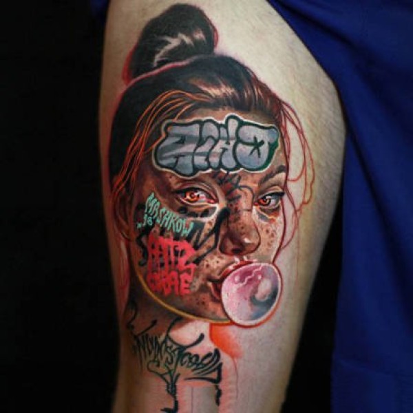 清纯女孩腿上可爱肖像纹身图片_肖像纹身图案大全_纹身图吧