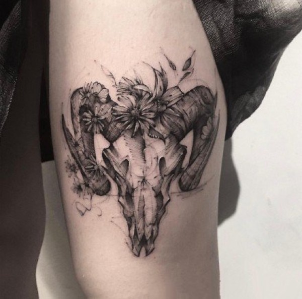 黑灰色玫瑰花和骷髅头纹身图片手稿
