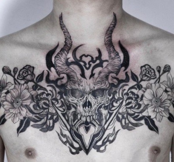 黑灰色玫瑰花和骷髅头纹身图片手稿