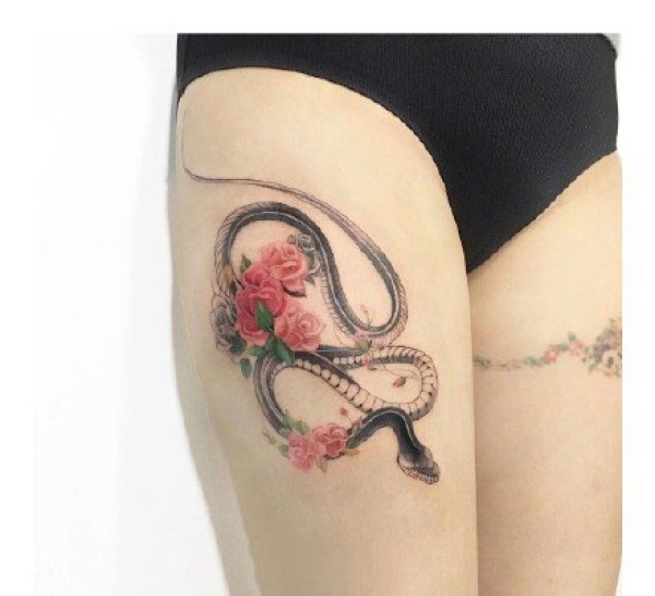 女生腿部唯美潮流的school玫瑰花纹身图案_玫瑰花纹身图案大全_纹身图吧