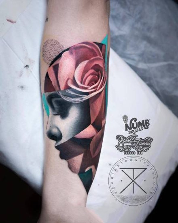 手臂上线条感很不错的黑灰欧美人像纹身图案