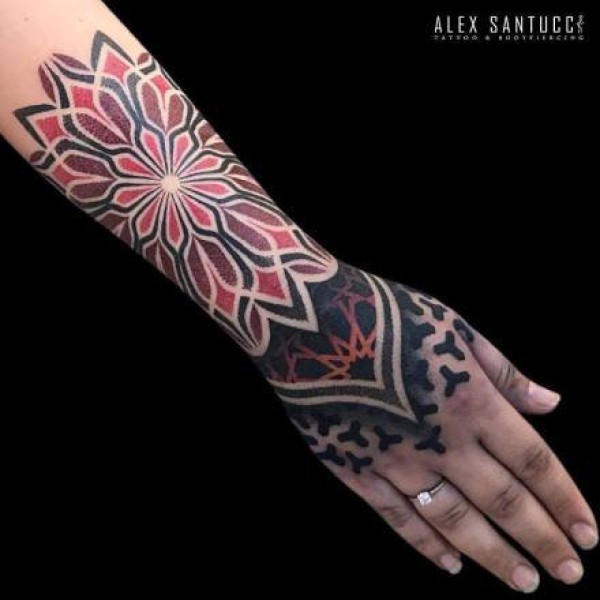 红色跟黑色搭配的繁花图腾纹身作品