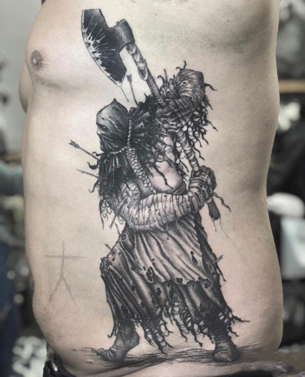 神秘的彩绘渐变抽象线条火焰和人物幽灵骑士纹身图案