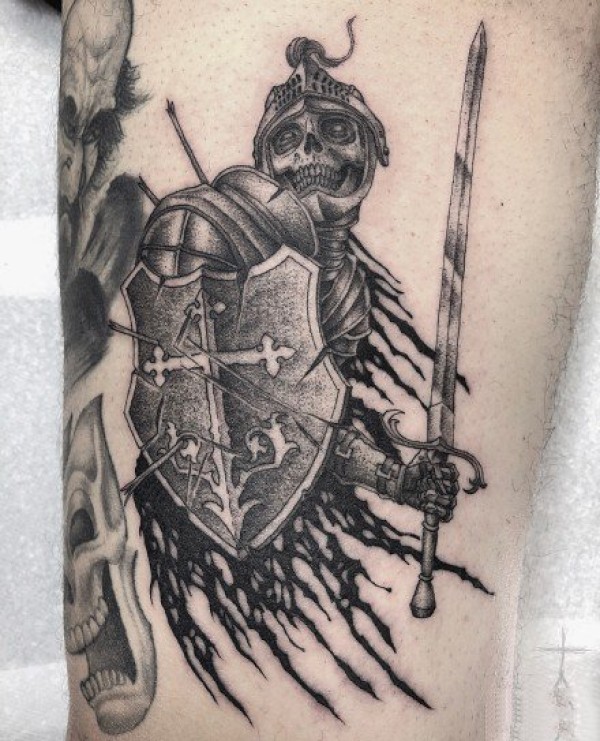 神秘的彩绘渐变抽象线条火焰和人物幽灵骑士纹身图案