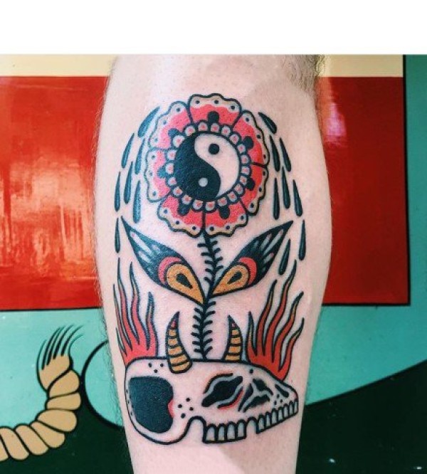 oldschool风格的太阳花主题纹身图片