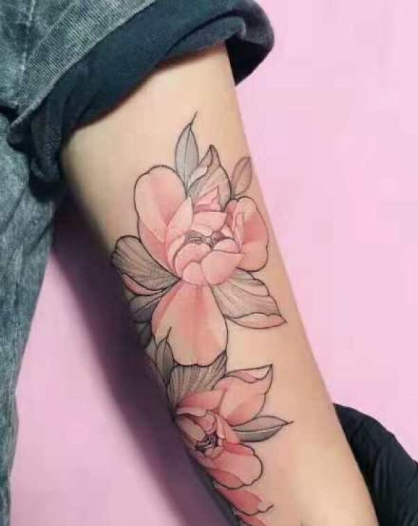古典精致的彩色花臂牡丹花艺妓海浪纹身图案