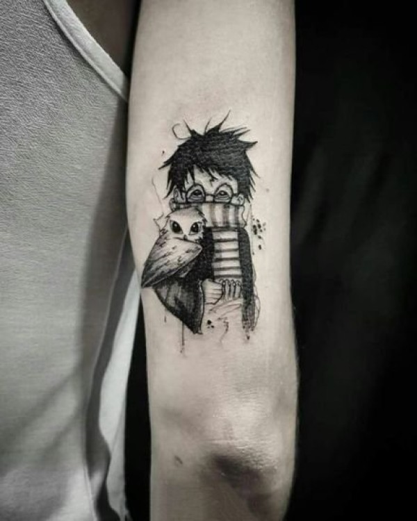 女生手臂上彩绘水彩素描创意哈利波特卡通元素纹身图片