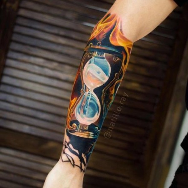手臂胳膊上的欧美黑灰钟表玫瑰纹身图案9张