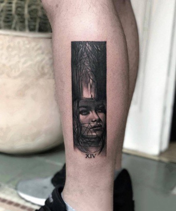 手臂上线条感很不错的黑灰欧美人像纹身图案