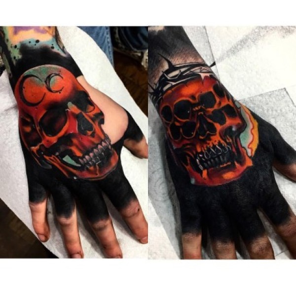 手背上逼真写实的重彩色纹身作品