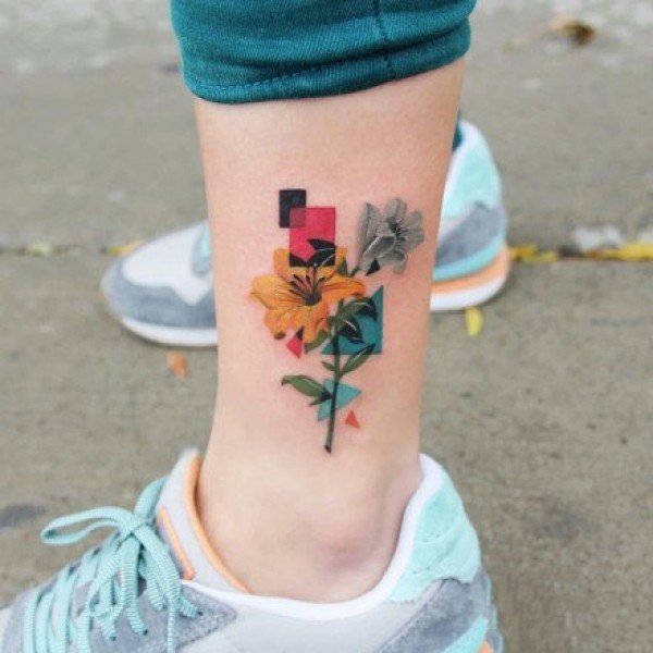 男生小腿上彩绘几何线条骷髅和人物肖像拼接纹身图片