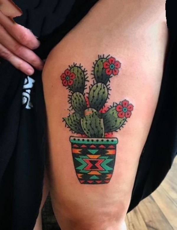 植物纹身 女生大腿上彩色的仙人掌纹身图片