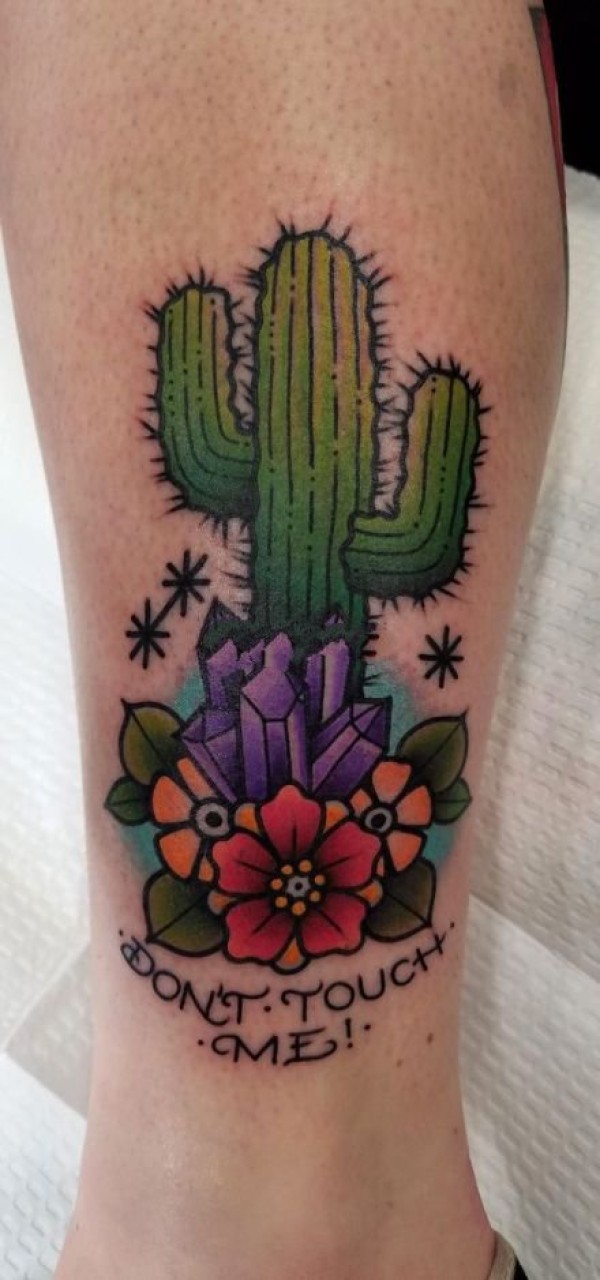 植物纹身 女生大腿上彩色的仙人掌纹身图片
