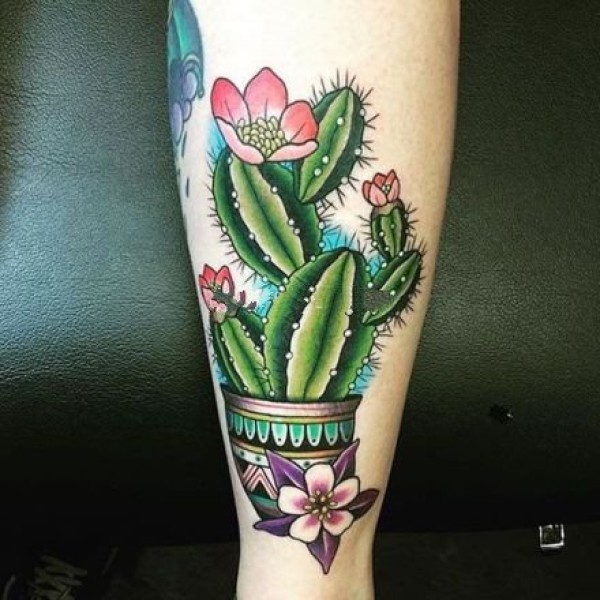 植物纹身 女生大腿上彩色的仙人掌纹身图片