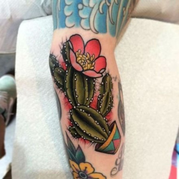 植物纹身 女生大腿上彩色的仙人掌纹身图片