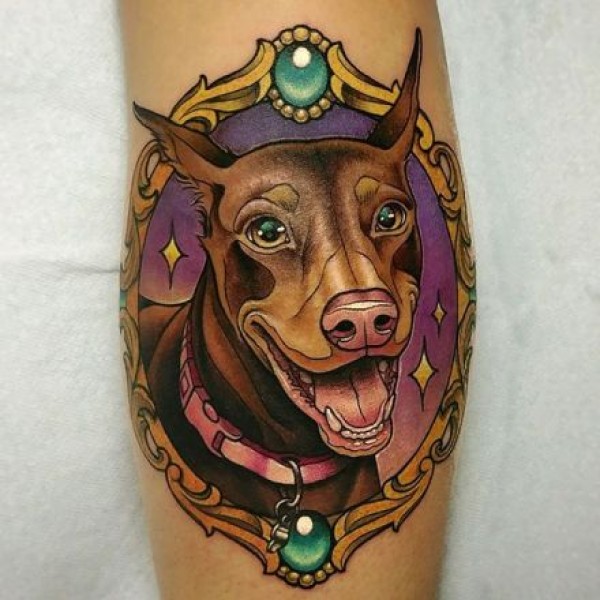 胸部彩色可爱的杜宾犬和项圈纹身图案