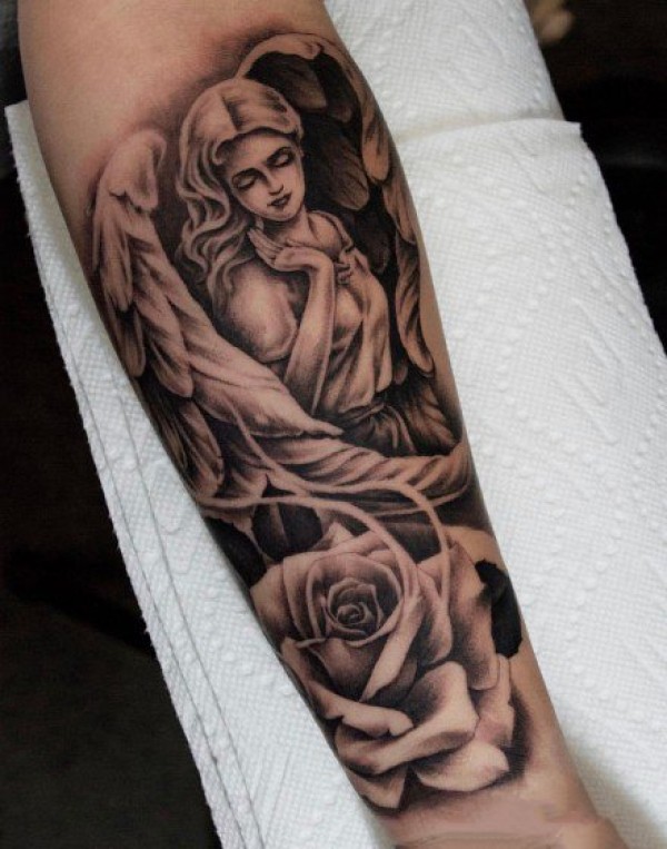 腿部黑灰天使纹身图案_天使纹身图案大全_纹身图吧