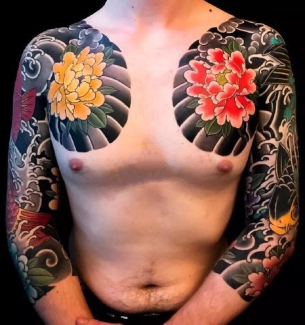 来自中国经典的传统半甲喜庆鲤鱼牡丹纹身手稿_半甲纹身图案大全_纹身图吧