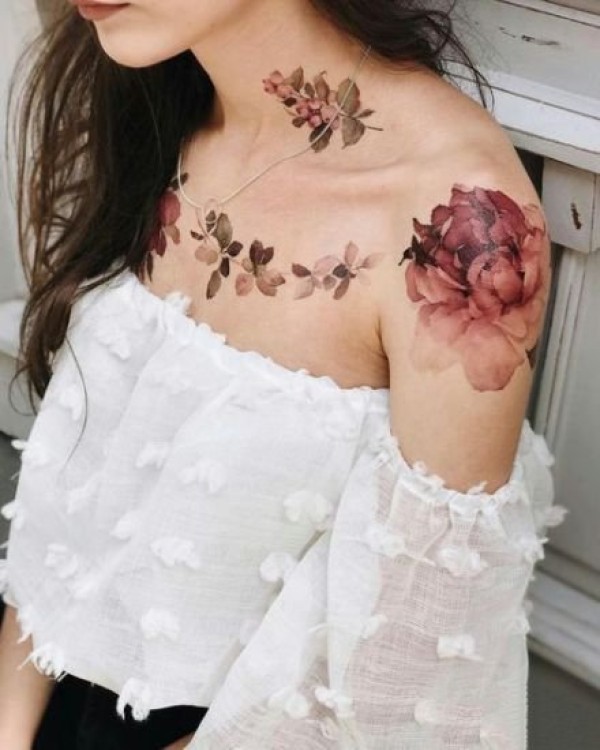 女性肩膀上多款漂亮的花朵纹身图案
