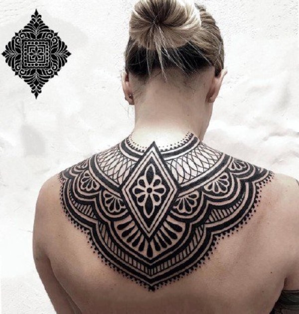 适合女生纹在后背脊柱处的唯美梵花纹身图案