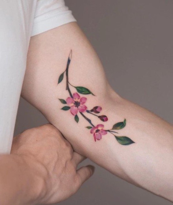 纹在手臂胳膊上的黑灰素花花卉纹身图案欣赏