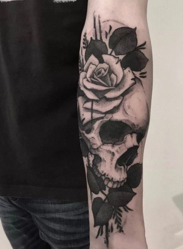 黑灰色玫瑰花和骷髅头纹身图片手稿