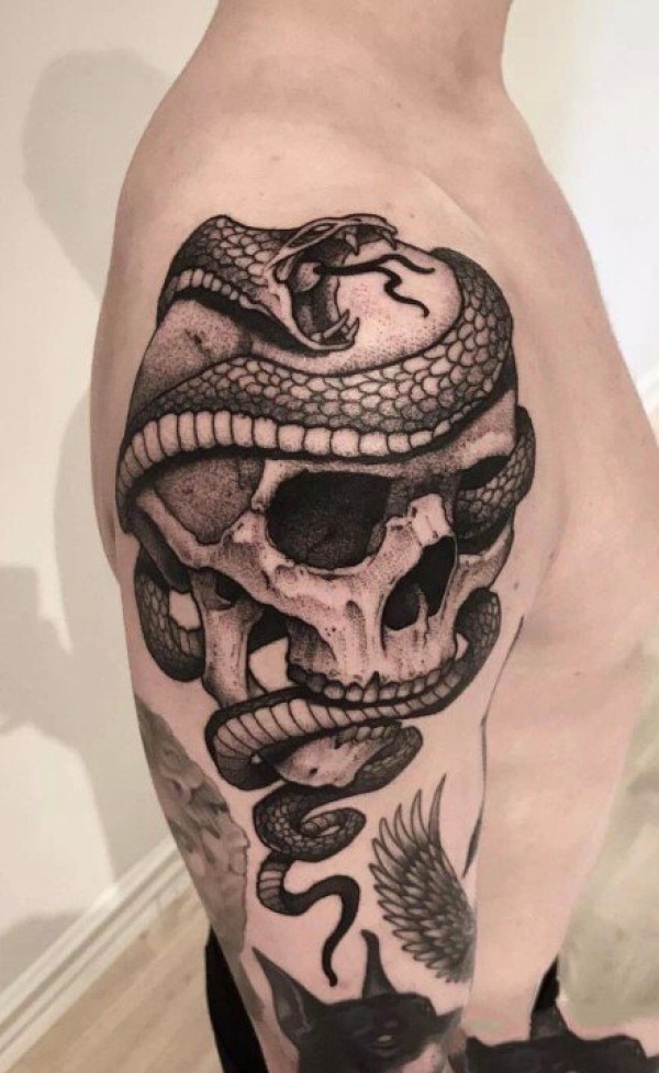 超帅时尚的黑灰骷髅与蛇纹身图案