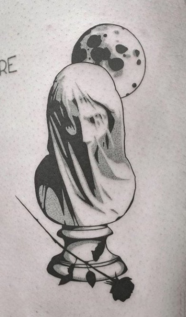 黑灰色玫瑰花和骷髅头纹身图片手稿