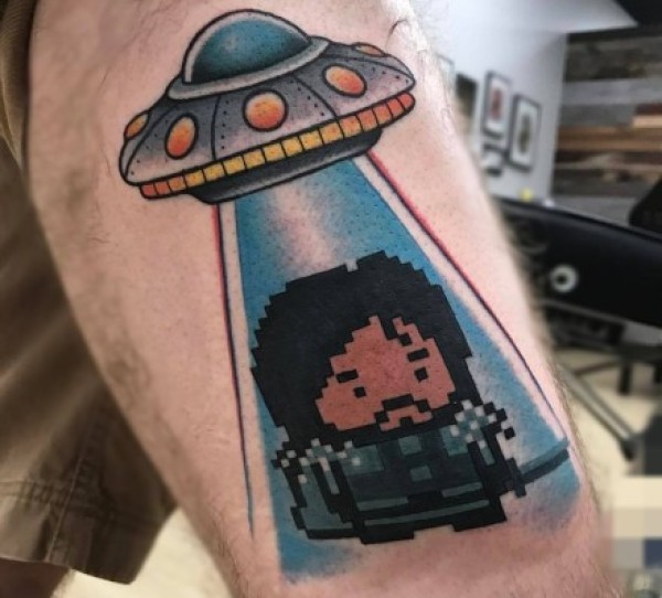 纹身黑色 男生大腿上人物和飞碟纹身图片