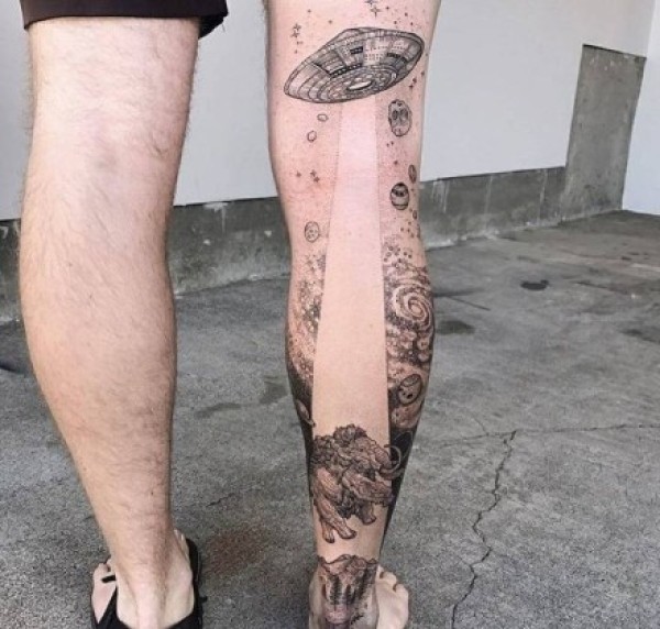 欧美小腿纹身 男生小腿上飞碟和建筑物纹身图片